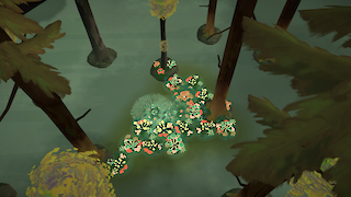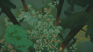 In meinem Spiel gibt es keine tierischen oder menschlichen Charaktere. Stattdessen sind die Spieler:innen Pilze, die versuchen, ihr Mykorrhizanetzwerk zu erweitern. Die Spieler:innen können Nährstoffe mit Bäumen austauschen, um ein stabileres und blühenderes Ökosystem aufzubauen. Sie können zudem das Pilznetzwerk weiter ausbauen und somit in seiner Funktionsweise verbessern.